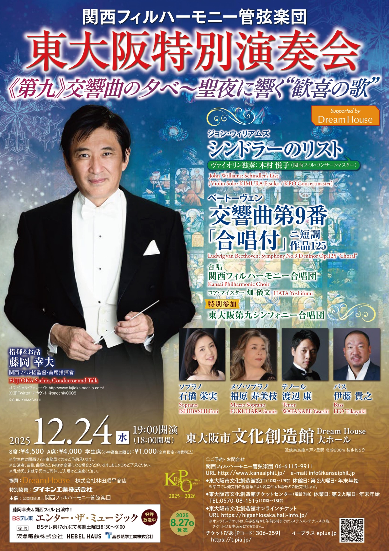●出演者指揮&お話:藤岡 幸夫(関西フィル総監督・首席指揮者)ソプラノ:石橋 栄実、メゾ・ソプラノ:福原 寿美枝テノール:渡辺 康、バス:伊藤 貴之合唱:関西フィルハーモニー合唱団、東大阪第九シンフォニー合唱団