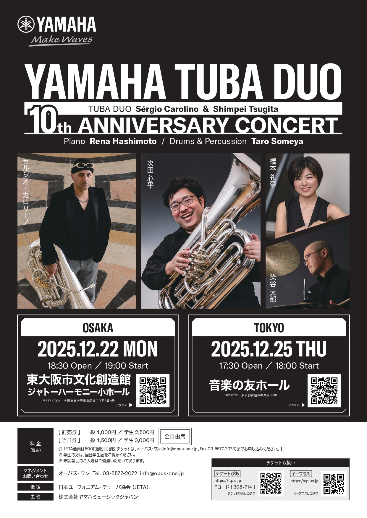 株式会社ヤマハミュージックジャパンTEL:03-5577-2072(担当:オーパス・ワン)e-mail:info@opus-one.jpHP:YAMAHA TUBA DUO 10th Anniversary Concert【大阪】 - 株式会社オーパス・ワン | Opus One Co., Ltd.